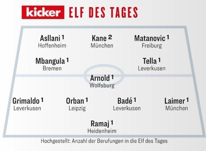 踢球者本轮德甲最佳阵:凯恩领衔,格里马尔多、莱默尔入选