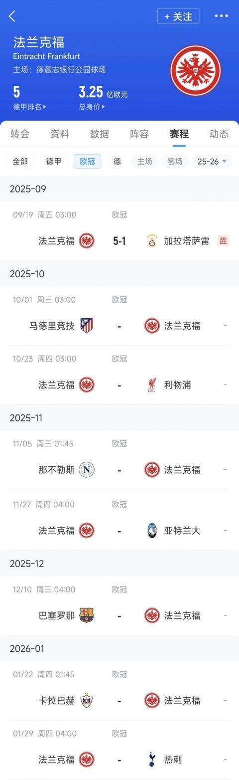 直播吧09月19日宣 欧冠首轮比赛,法兰克福5-1大胜加拉塔萨雷,得以排在欧冠积分榜第1位。