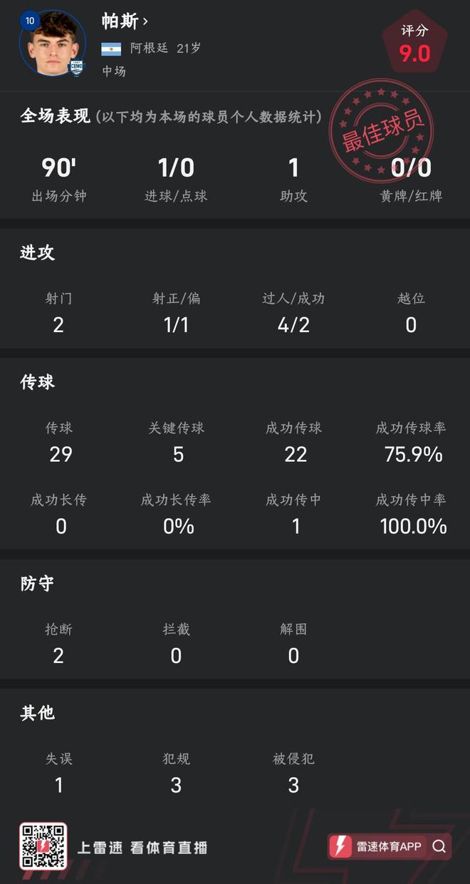 但在临场对决中,阿根廷新星帕斯的表现完全碾压土耳其新星伊尔迪兹。帕斯此役踢满90分钟贡献1射1传。帕斯全场2次射门1次射正攻入1球,4次尝试过人其中2次过人成功。传球方面,帕斯全场完成29次传球,22次传球成功(含5次关键传球、1次助攻),传球成功率达到75.9%。此外,帕斯此役2次抢断、3次被侵犯,另有1次失误及3次犯规。