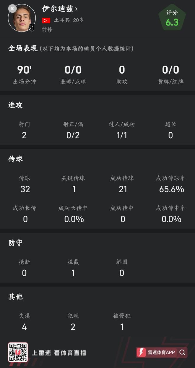 伊尔迪兹同样踢满90分钟,全场2次射门全部射偏。1次尝试过人且成功。传球方面,伊尔迪兹全场32次传球,其中21次传球成功(含1次关键传球),传球成功率65.6%。防守端,伊尔迪兹全场仅完成1次拦截。此外,伊尔迪兹全场4次失误、2次犯规且1次被侵犯。