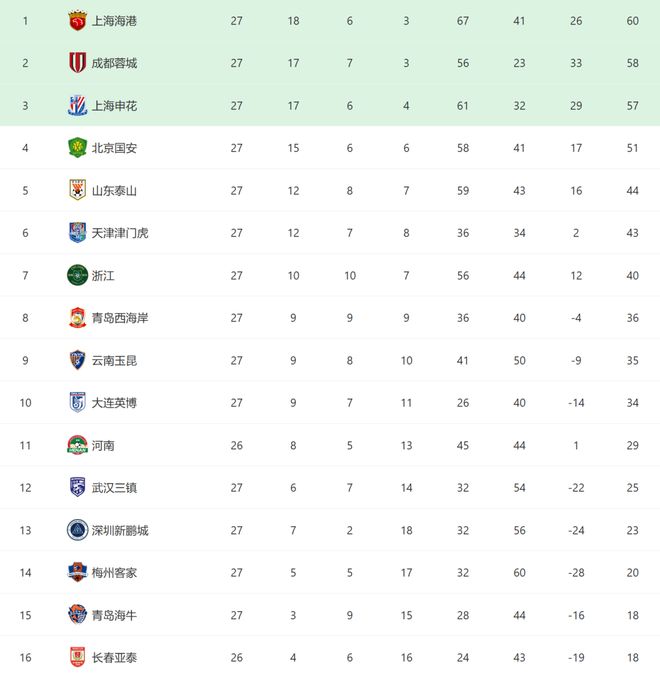 - 中超 | 中超第27轮青岛西海岸12上海申花积分榜上海申花57分位列第三
