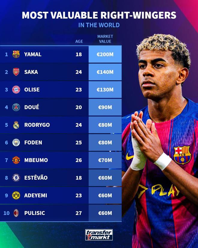 - 英超 | 德转列右边锋身价榜:亚马尔2亿欧居首,萨卡第二奥利塞第三