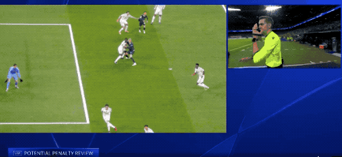 裁判蒂尔潘毫不犹豫,第一时间判罚点球,VAR介入,犯规地点在禁区外,蒂尔潘改判任意球。