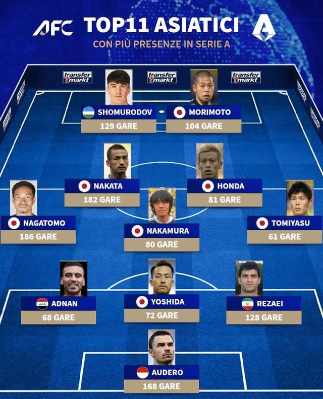 - 意甲 | 中田英寿领衔!意甲出场最多亚洲11人阵容,日本球员竟独占7席