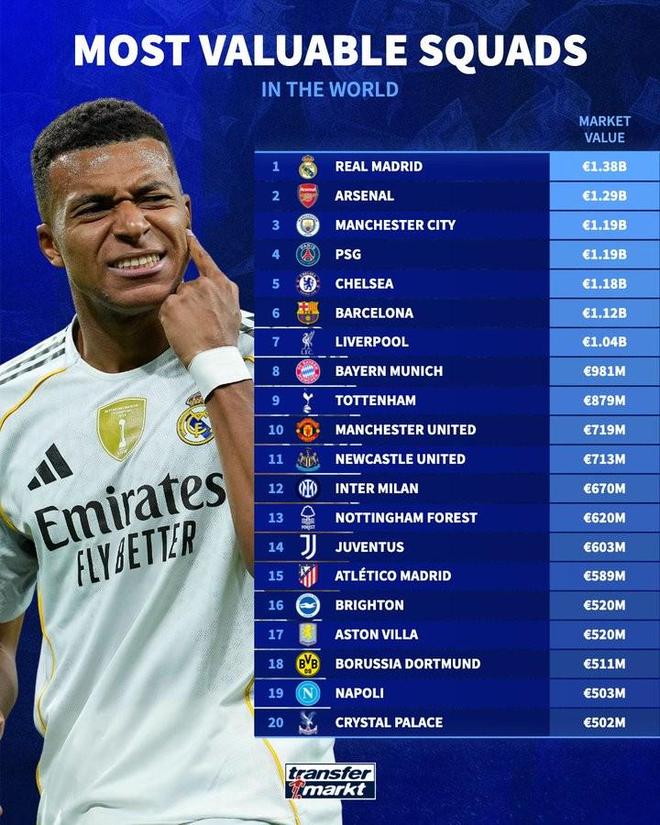 - 英超 | 德转列总身价最高球队排名:皇马13.8亿欧居首,阿森纳第二