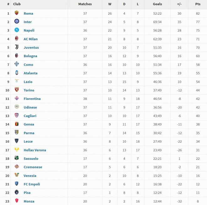 - 意甲 | 意甲2025年度积分榜:罗马37场26胜82分居首,国米次席