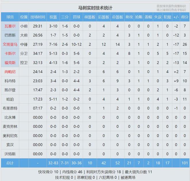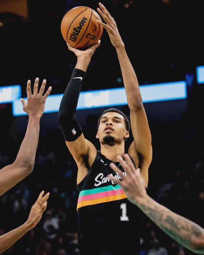 文班复出之后打了9场比赛,前7场替补出战,马刺6胜1负;最近两场比赛,文班重返首发阵容,马刺0胜2负。今天文班投篮16中7,三分6中2,罚球12中10,拿到26分14篮板3助攻1抢断1盖帽2失误,正负值-17并列全场最低。